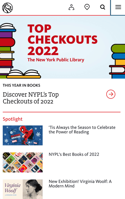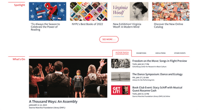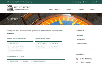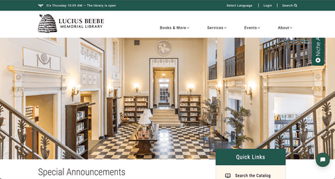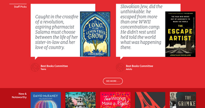 - Book lists (e.g. "New Arrivals") use imagery from, and link directly to, a NOBLE catalog entry. Hopefully website admins can assemble these lists natively in the CMS via integration with NOBLE catalog. Allowing patrons to quickly access the actual catalog entry is good, but it would also be nice to have the option to elaborate on what makes each book noteworthy (themed per website aesthetic) before sending users to the catalog.