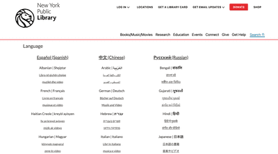 - There is a "Language" page with catalog links for numerous languages and per-language resource pages. Some pages, e.g. library card request form page, have been translated into multiple languages. However, full-site translation appears to be missing/WIP